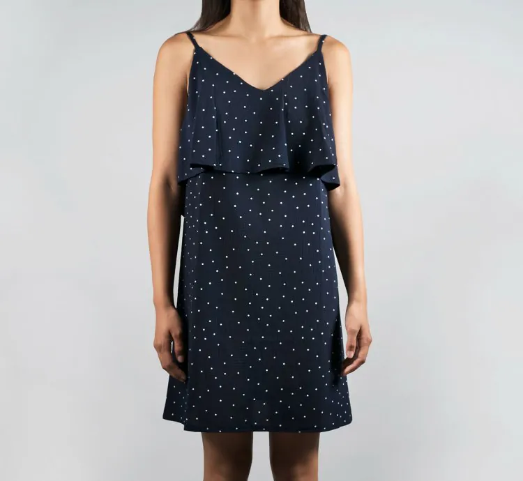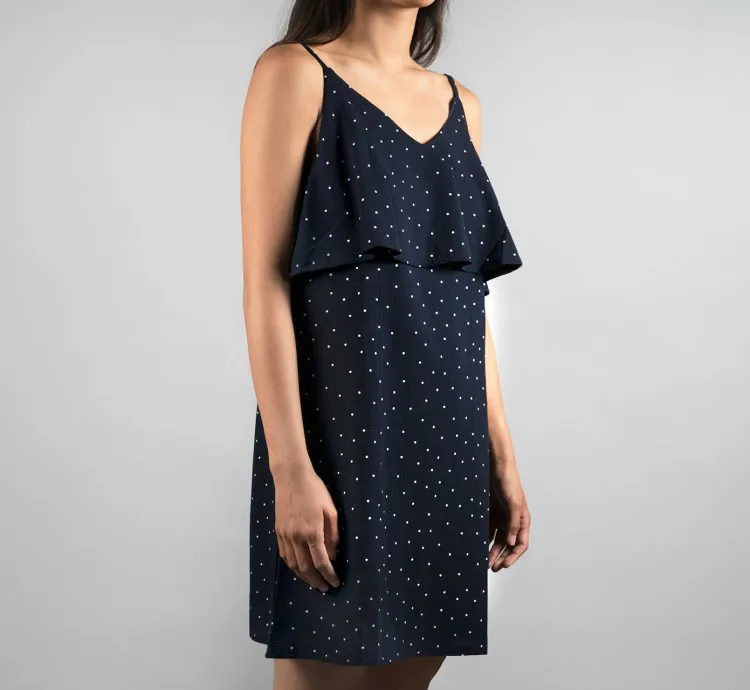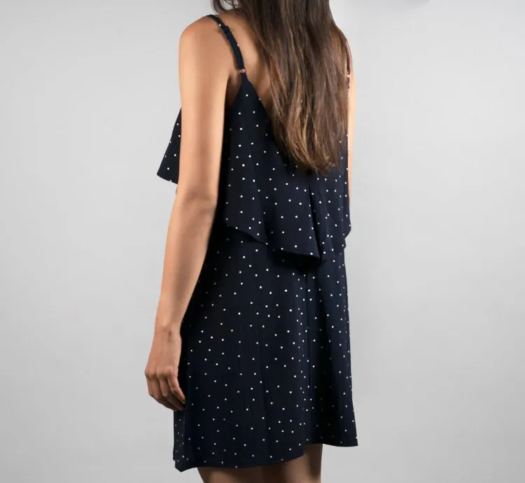 The Navy Polka Dot Dress is a charming and stylish addition to any wardrobe, perfect for a variety of occasions. Crafted from lightweight, breathable fabric, this dress features a classic navy backdrop adorned with playful white polka dots that add a fun, vintage-inspired touch. The flattering silhouette cinches at the waist, enhancing your figure while providing a comfortable fit. With its versatile design, this dress can easily transition from day to night—pair it with sandals for a casual brunch or dress it up with heels and accessories for a night out. Embrace timeless elegance with the Navy Polka Dot Dress, a staple piece that never goes out of style.